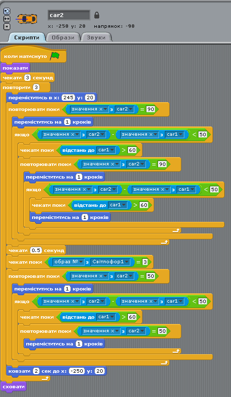 На вкаладенні Скрипти для кожного з об'єктів Car1.jpg, Car2jpg, Car3.jpg створити свій скрипт, який буде відрізнятись лише контролем взаєморозташування авто для запобігання наїзду однієї машини на іншу. За допомогою вкладених алгоритмічних операторів циклу та розгалуження реалізувати таке: кожне авто буде під'їжджати до світлофора та чекати дозвільного сигналу від світлофору.