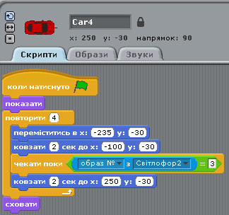 На вкладенні Скрипти для кожного з об'єктів Car4, Car5, Car6, Car7 створити свій скрипт, який буде відрізнятись лише координатами початку та закінчення руху на відповідній дорозі. Кожен з чотирьох скриптів матиме вказівки підїзду машини до перехрестя та переміщення її після перевірки дії світлофора.