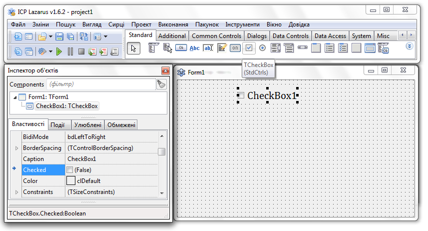 CheckBox (Прапорець) з вкладення Standard призначена для того, щоб користувач міг вказати своє рішення типу так/ні або так/ні/не впевнений.