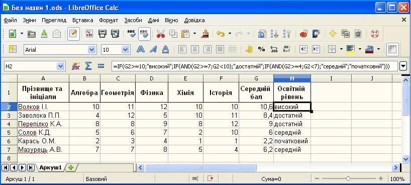 Приклад 6. Визначити рівень освітніх досягнень учнів залежно від їх середнього балу, використовуючи Помічник з функцій).