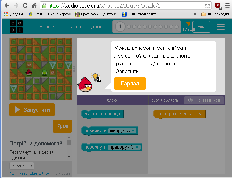 Почати сладати скрипт. Для цього уважно роздивитися малюнок у лівій частині вікна і порахувати кількість кроків, які потрібно зробити Реду, щоб дійти до зеленого поросяти та перетягнути їх у поле скриптів. Щоб перетягнути вказівку, потрібно навести на неї вказівник миші, натиснути ліву кнопку миші і, не відпускаючи її, перетягнути вказівку на потрібне місце.