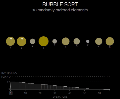 Алгоритм отримав свою назву від того, що процес упорядкування нагадує поведінку бульбашок повітря у резервуарі з водою. Для кращого розуміння див. ілюстрацію упорядкування 10-елементного масиву, запозичену за такою адресою: https://cdn.tproger.ru/wp-content/uploads/2017/09/BubbleSort.gif: